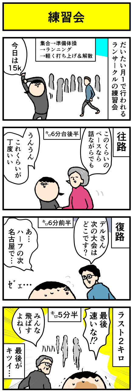 2024年01月12日 練習会でありがちなこと アロ~ハ☆今日も元気なデルぽんで~す☆本日はランニングな話ー!!ランサークルの練習会あるあるを漫画にしたよ!どうぞー!!みんなが集まる全体練習のとき、行きはゆっくり、帰りは各々のペースで、というのが暗黙の了解?なのだが、速い人は㌔4分前後であっという間に見 カテゴリ: デルマンガ