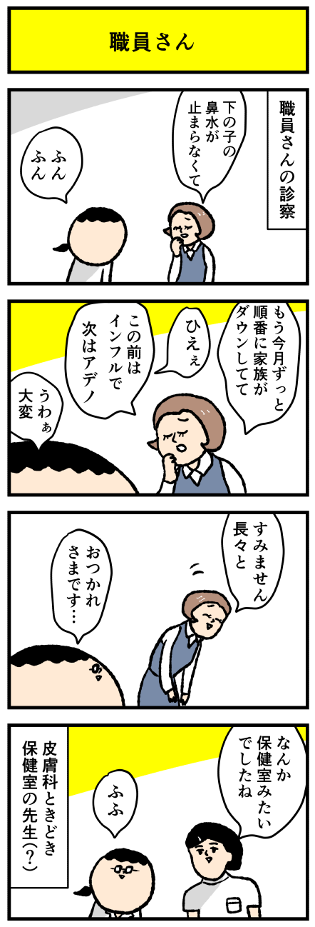 2023年12月24日 保健室の先生?? アロ~ハ☆今日も元気なデルぽんで~す☆本日は外来??な話ー!!どうぞー!!このスタッフさん(幼児子育て中)がくるといつも皮膚科あんまり関係ない雑談で診察がだいたいおわる!とくに治療的にお役に立ててない(鼻水とか)くて、傾聴と共感だけ!ほぼそれだけ!(私に カテゴリ: デルマンガ