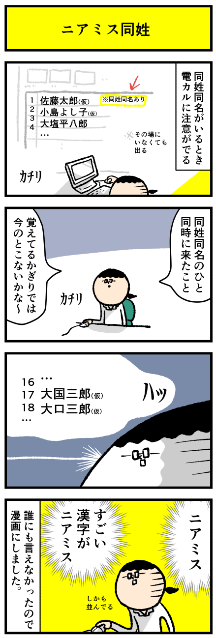 2023年11月29日 ニアミス同姓同名 アロ~ハ☆今日も元気なデルぽんで~す☆本日も外来なお話~!ニアミス同姓が来た?!どうぞー!!すんごいくだらんネタで申し訳ないのだが連続で並んでる!一字ちがい!しかも字の形まで似てる!同姓同名じゃないけどすごく似てる~~~~~!!!!っていうのをその場の誰 カテゴリ: デルマンガ