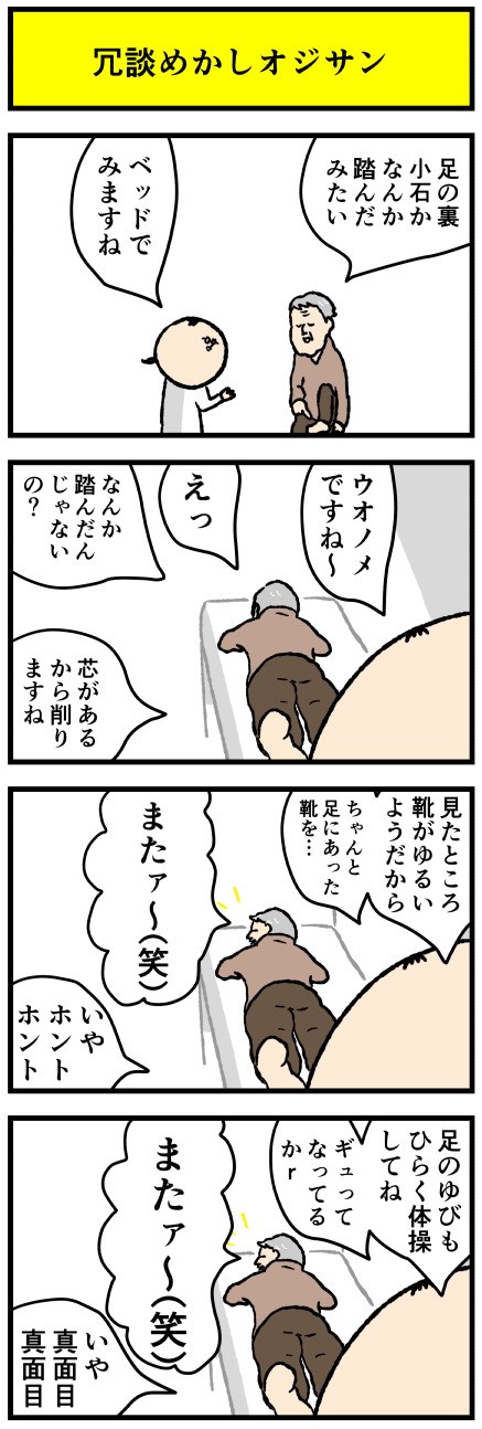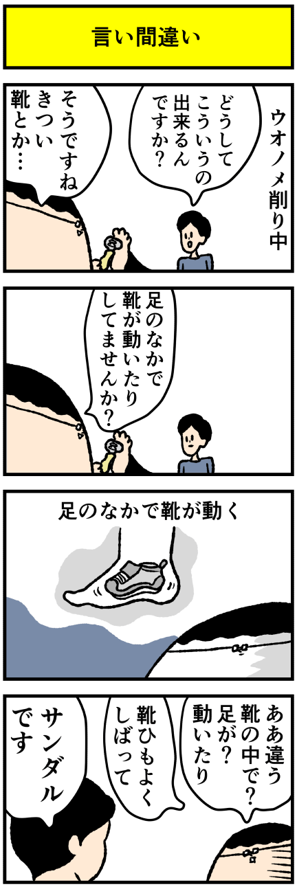 2017年06月25日 外来での言い間違い アロ〜ハ☆ 今日も元気なデルぽんで〜す! 本日は言い間違いな漫画☆ どうぞ〜〜!! 何故かいつも間違えがち、、、 キツイ靴もよくないが、 ゆるすぎる靴にもご注意☆ (適度なフィット感大事) でわね!バーイ☆ 足の中の靴の中の足の、、、読者登録で漫画 カテゴリ: 日常マンガ