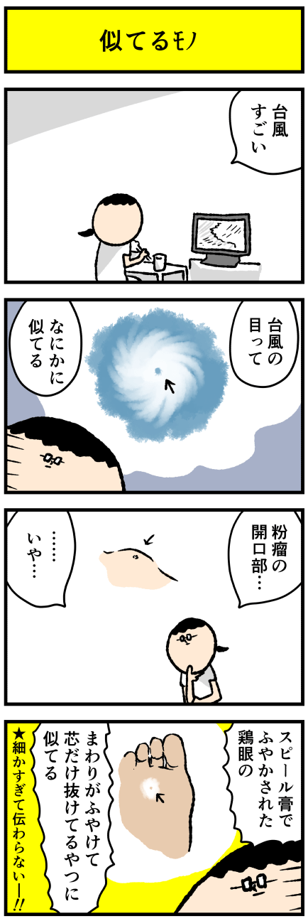 2022年09月02日 台風の目に似てるもの?ウオノメでお悩みの貴方へ アロ~ハ☆今日も元気なデルぽんで~す☆本日は日常?漫画?台風の目がこれににてる?!どうぞ~~!!なんていうかあの白いなかにポツンと小さな丸が抜けている感じが似ている・・・(細かすぎて伝わらないネタ)魚の目すなわち鶏眼ね軟膏でなんとかできませんか?とよくき カテゴリ: デルマンガ