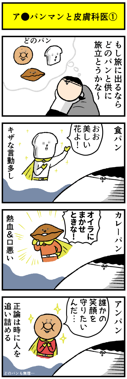 2017年08月18日 ア●パンマンと皮膚科医① アロ~ハ☆今日も元気なデルぽんで~す☆ほんじつはアンパンネタでーす!どうぞ~~!食すならアンパンが好きでーす!!交換されたあとの顔がどこへ消えていくのかいつも不思議だったー!!でわね!バーイ☆ あえて選ぶならカレーパン・・・読者登録で漫画をお届け☆LINET カテゴリ: 日常マンガ