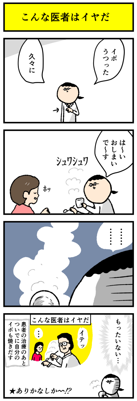 2023年07月05日 イボうつった〜こんな医者はイヤだ〜 アロ~ハ☆今日も元気なデルぽんで~す☆久々に指にイボできたー!カナシミのマンガ!どうぞー!!あっセンセもイボあるんだ・・・(???)っておもわれるかなけっきょく焼くのがいちばん手頃で確実・・痛いけどもすごい懐かしのマンガ↓ またやるかー!自分にジュウジュウ カテゴリ: デルマンガ