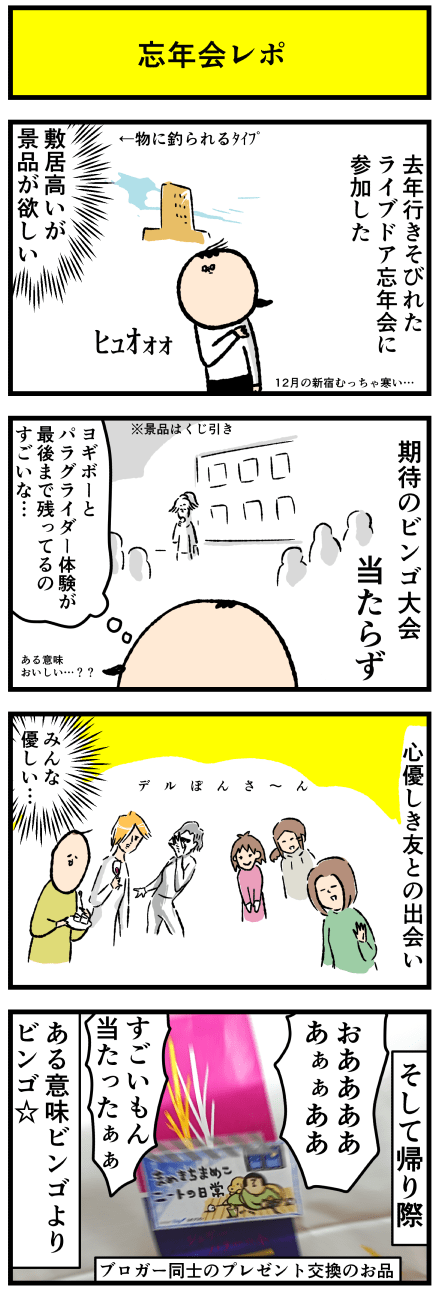 2019年12月18日 ライブドアブログ忘年会2019 アロ~ハ☆今日も元気なデルぽんで~す☆今年も忘年会の季節がやってきた!ライブドア主催の忘年会に行ってきたのでその時のことを漫画にしたよー!どうぞー!!スタバ行くと後先考えず季節のフレーバーを頼むクセが災いした・・・でもケーキは食べた。帝国ホテルのケーキ美 カテゴリ: 日常マンガ