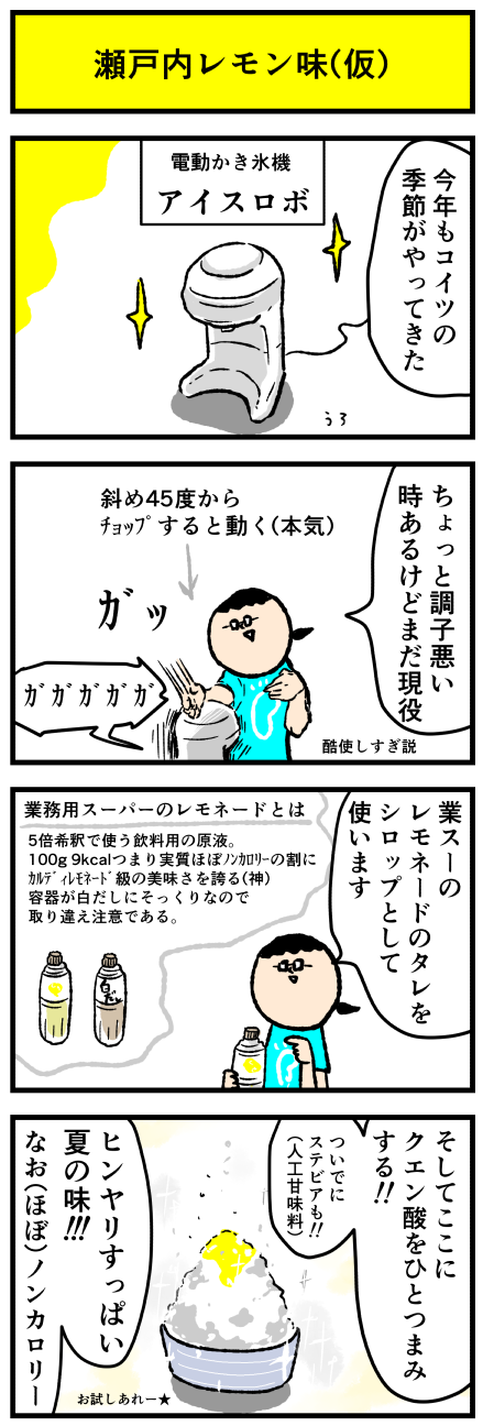 2022年07月04日 おいしすぎる神々のかき氷が爆誕した アロ~ハ☆今日も元気なデルぽんで~す☆本日は日常漫画☆彡おいしすぎる神々のかき氷が爆誕してしまったので漫画にしたよ!!どうぞー!!!!この味を瀬戸内レモン味(仮)と名付けよう・・・・🐈誰かネーミングセンスください👐☆アイスロボに関してはこちらの記事にー! カテゴリ: 日常マンガ