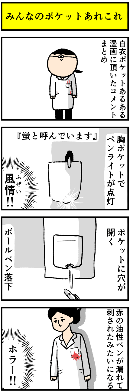 2017年06月11日 白衣ポケット漫画にいただいたコメント漫画 アロ~ハ☆今日も元気なデルぽんで~す☆先日の白衣ポケットあるあるにたくさん反応ありがとう~~~~~~!!!面白いので漫画にしたよ!どうぞ~~!デルぽんの白衣はポケット穴空いたことないよ~!でも空いてるひとがいっぱいいた!!ペンライトはあるあるですね!蛍・ カテゴリ: 日常マンガ