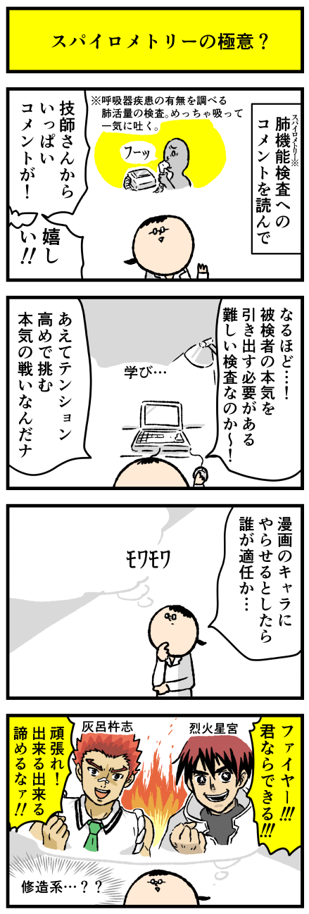 2020年12月16日 スパイロメトリーを応援してほしいキャラ アロ~ハ☆今日も元気なデルぽんで~す☆前回の記事コメントでスパイロが大人気?!技師さんたちのコメントを読んで思ったことを漫画にしたよー!どうぞ!!コメントいただいた皆様ありがとうございます☆彡なるほどお互いが本気にならなければ正確な値を導きだせない熱い検 カテゴリ: デルマンガ