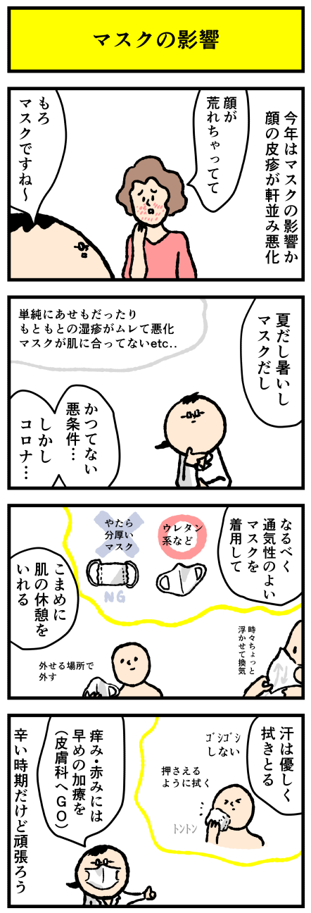 2020年08月17日 最近多いマスクのお悩み アロ~ハ☆今日も元気なデルぽんで~す☆今年はマスクで顔の皮膚が調子悪い患者さんが増えている。。今日はそのことを漫画にしたよー!どうぞー!!マスク自体が合ってない可能性もあるけれど、ムレる、こすれる、マスクの下で汗をかくことが主な原因。外せるところではしっ カテゴリ: デルマンガ