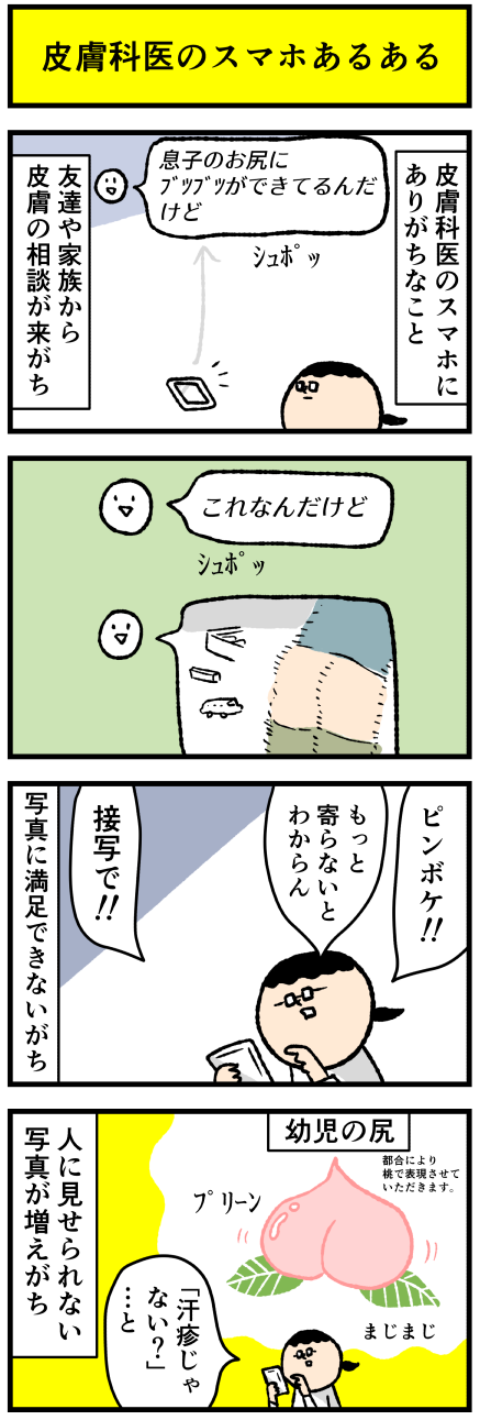 2022年02月15日 皮膚科医のスマホにありがちなこと アロ~ハ☆今日も元気なデルぽんで~す☆本日はスマホのあるある!皮膚科医のスマホにありがちなことを漫画にしたよ~!!どうぞ~!!LINEの皮膚相談おおいんだけど、だいたいにおいて写真に満足できないがち・・・皮疹をみるのに「寄り」の接写写真あるとイイね!マクロ撮 カテゴリ: デルマンガ
