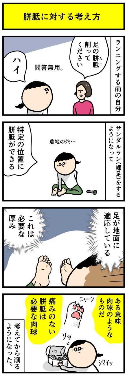 2023年11月06日 足のタコは肉球かもしれない アロ~ハ☆今日も元気なデルぽんで~す☆デルぽん走るようになって足の裏にタコができるようになったんだけどね!ベンチ削り(ベンチ←何故か変換できない。タコのこと!)についての考え方がすこし変わったので漫画にしたよ!どうぞー!!!べんち削り、タコ削ってくださー カテゴリ: デルマンガ