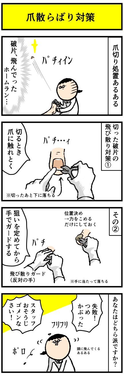 2024年01月17日 【漫画再掲】爪切り処置の飛び散り対策(ケアネット第87回) アロ~ハ☆今日も元気なデルぽんで~す☆先月のケアネット(会員制サイト)漫画の再掲です!元記事こちら↓ どうぞ〜〜〜!!油断するとすぐ爪飛んでく・・爪を飛ばさないスマートな爪切り?!飛んでいっても切れればよし?!でわね!バーイ☆彡 飛びちったときの申し訳な カテゴリ: デルマンガ