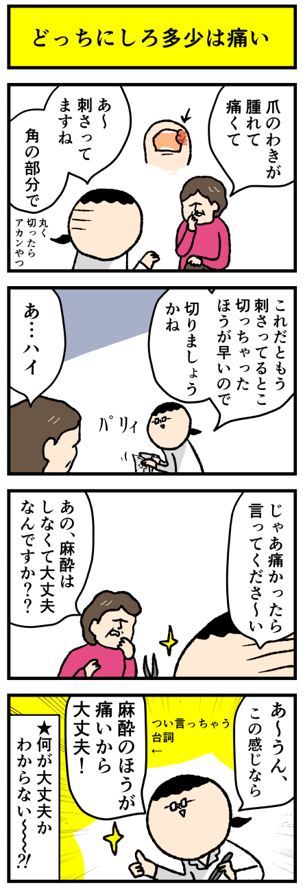 2023年08月26日 【漫画再掲】爪まわりの処置でありがちなこと(ケアネット第83回) アロ~ハ☆今日も元気なデルぽんで~す☆先月のケアネット(会員制サイト)漫画の再掲です!元記事こちら↓ どうぞー!!麻酔も注射だから無痛という訳にいかないのよ・・・刺さってる爪の処置、爪自体は浮いてるから、注意深くやればさほど痛みを与えずに食い込み除去できる カテゴリ: デルマンガ