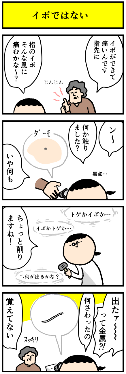 2024年01月19日 イボじゃないと思ったら アロ~ハ☆今日も元気なデルぽんで~す☆本日は外来な漫画~☆彡それはイボ?それとも異物??何がでるかな♪♪で削ったところ?!どうぞー!!非常にスッキリされてご帰宅された・・・いやなんの金属片なの~~~?!気になって夜も眠れない~~~~!!!耳鼻科みたいに異 カテゴリ: デルマンガ