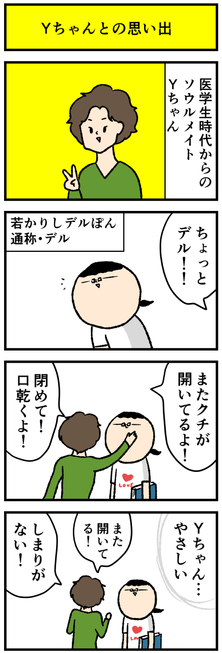 2017年11月04日 医学部時代の思い出~Yちゃん~ アロ~ハ☆今日も元気なデルぽんで~す☆本日は医学部な漫画☆学生時代の思い出を漫画にしました~~!どうぞ~~~☆今でも時々くちが開いているとYちゃんのことを思いだす・・・鼻呼吸してるのに気づくと口が開いている謎~~~!口閉める!でわね!バーイ☆ さいきん疎 カテゴリ: 日常マンガ