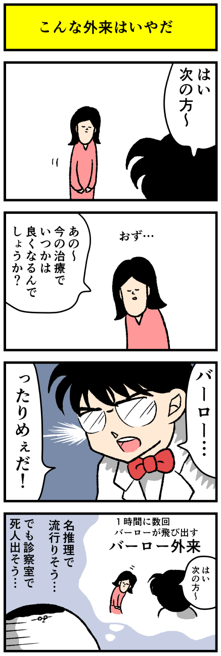 2018年01月04日 こんな外来は嫌だ アロ~ハ☆今日も元気なデルぽんで~す☆今年も気づいたら明けていた!!皆様本年もよろしくお願いいたします〜〜☆本日は妄想ネタ〜!どうぞ〜〜新年早々こんなネタでごめりんこ☆仕事が休みだとネタがない……最近おもうのは優しいだけが優しさじゃない愛のあるバーローも カテゴリ: 日常マンガ