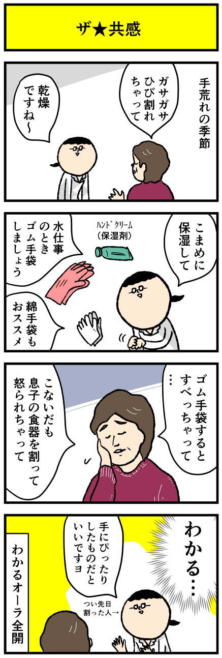 2017年03月15日 手荒れに絆創膏はNGな件 アロ~ハ☆今日も元気なデルぽんで~す☆本日もまじめ皮膚科漫画!どうぞー! うん気持ちはわかるの。アカギレで痛いし水でしみるし当たっても痛い、水仕事の前にアレ貼っとこうってなる気持ちわかるうんうん。だが手荒れアカギレに絆創膏の相性の悪さよ。悪化してしまう~ カテゴリ: デルマンガ