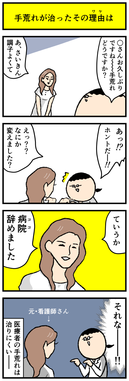 2021年08月17日 【漫画再掲】てごわい手荒れがスッキリ治った理由(ケアネット第51回) アロ~ハ☆今日も元気なデルぽんで~す☆先月のケアネット(会員制サイト)漫画の再掲です!元記事こちら↓ どうぞー!!手荒れは主婦湿疹ともいわれて主婦など手をよく使う人に多い湿疹。 手洗いや素手の作業が多い医療者の手はつねに乾燥しがちで刺激にさらされており、湿 カテゴリ: デルマンガ