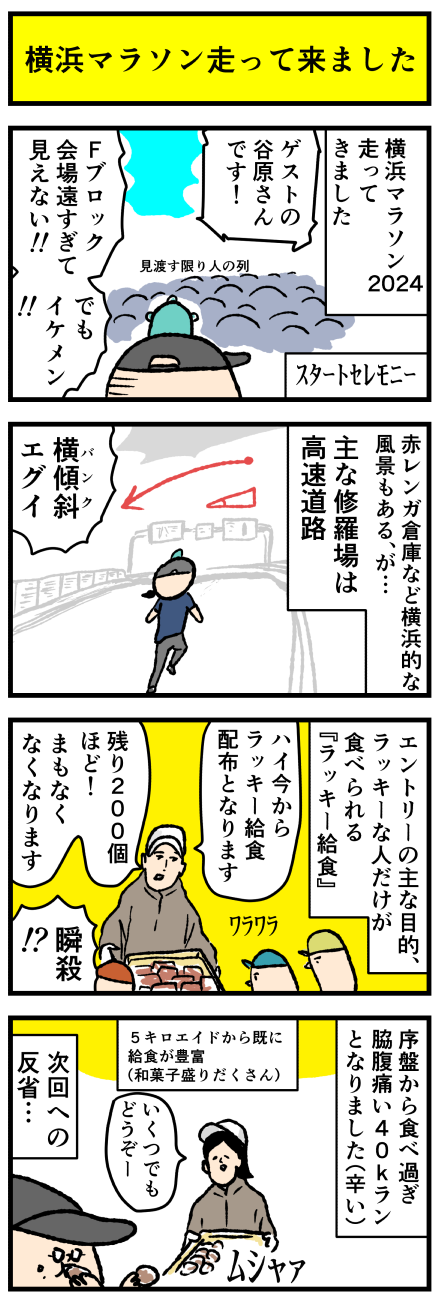 2024年11月15日 横浜マラソン走ってきたよ☆ アロ~ハ☆今日も元気なデルぽんで~す☆気づけばいつも浦島太郎?!先月末からもう2週間も経っている・・・など・・・?!横浜マラソン走ってきたので漫画にしたよー!!どうぞー!!!スタートセレモニーで谷原さんのイケメンヴォイスを聴いた・・・姿は1ミリも見えなか カテゴリ: 日常マンガ