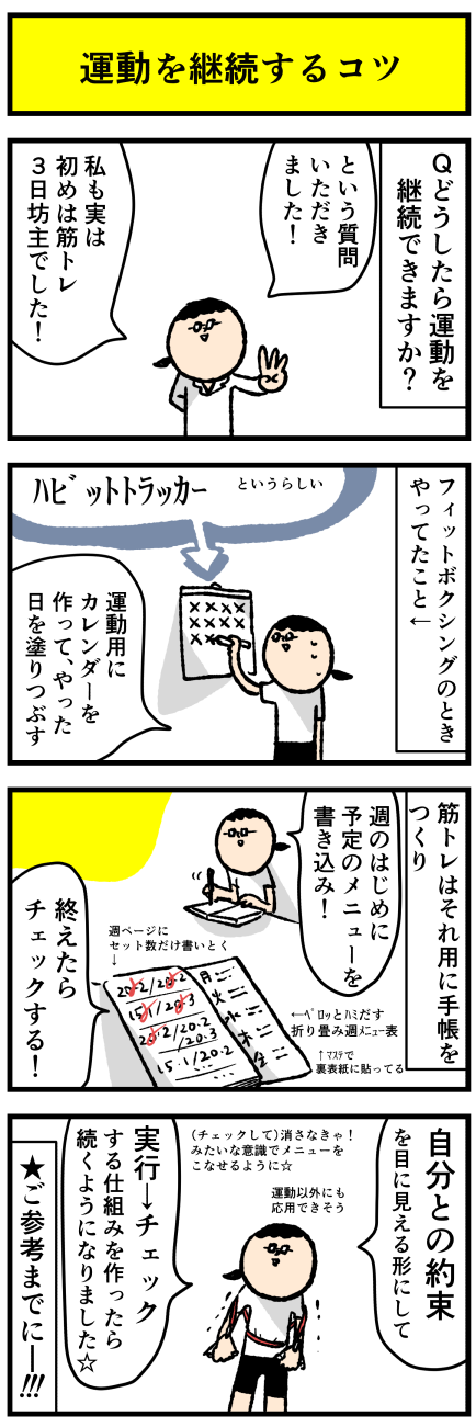 2022年05月15日 Q.どうしたら運動を続けられるか?筋トレなど続ける秘訣! アロ~ハ☆今日も元気なデルぽんで~す☆本日はいただいた質問へのお答えです!!どうしたら運動を続けれるか???自分もはじめは3日坊主だったからよくわかる!!!デルぽんがフィットボクシング&筋トレを続けられるようになった方法を漫画にしたよー!!どうぞー!!!はじめ筋 カテゴリ: 日常マンガ