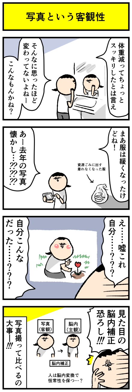 2021年11月15日 脳内変換が優秀すぎる?件 アロ~ハ☆今日も元気なデルぽんで~す☆本日は減量なお話~☆彡ヒトの脳内変換が優秀すぎる???と思った件について漫画にしたよ!どうぞー!!ダイエットに関わらず何かしら見た目の変化を客観的に追おうと思ったら写真に撮って比較するのがやっぱり一番なんだなと改めて カテゴリ: 日常マンガ