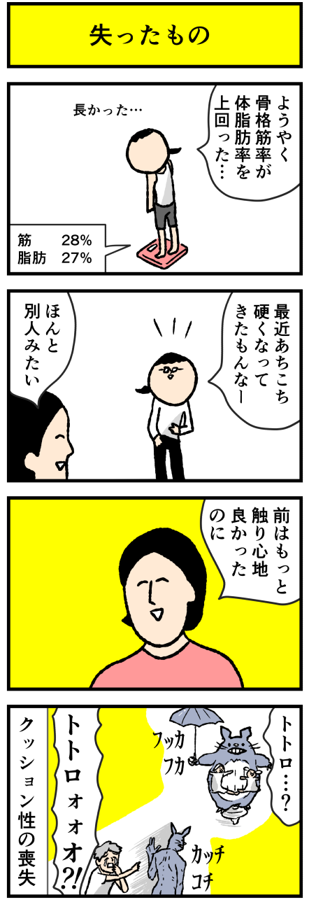 2021年12月12日 脂肪と引き換えに失ったもの アロ~ハ☆今日も元気なデルぽんで~す☆本日は体組成なお話ー!!最近の変化を漫画にしたよ!!どうぞー!!トトロビフォアフター・・・最近たしかにあちこち硬くなってきているのを感じる☆彡体って変わるのね。筋肉は裏切らない。目指せ骨格筋率30%~~~!!!筋トレもボ カテゴリ: 日常マンガ