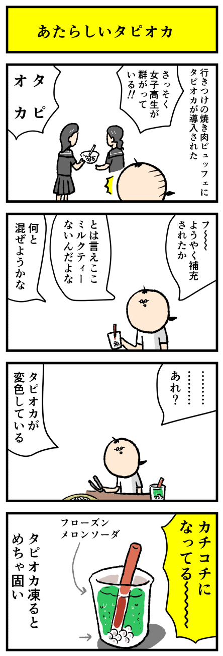 2019年09月29日 あたらしいタピオカ アロ~ハ☆今日も元気なデルぽんで~す☆本日は日常マンガ~☆タピオカに関する新知見でーす!!どうぞー!!いつも焼き肉の締めはフローズンメロンソーダって決めてるからその流れでタピオカ投入したら見事に凍ったよね・・・フローズンのフローズン力舐めてた・・・仕方が カテゴリ: 日常マンガ