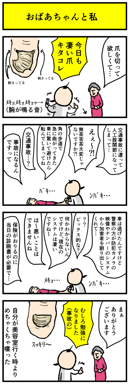 2020年01月14日 凄い爪とおばあちゃんと交通事故 アロ~ハ☆今日も元気なデルぽんで~す☆本日は外来な漫画☆どうぞー!!久しぶりに腕の鳴る爪で綺麗になる頃にはおばあちゃんの身の上話もすっかり最後まで聞き終えた☆交通事故の話、車と直接接触しなくても、場合によっては事故扱いになるらしく?逃走した車はナンバーと カテゴリ: デルマンガ