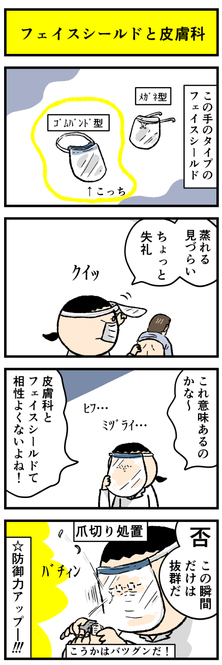 2022年11月18日 【漫画再掲】皮膚科とフェイスシールドって(ケアネット第66回) アロ~ハ☆今日も元気なデルぽんで~す☆先月のケアネット(会員制サイト)漫画の再掲です!元記事こちら↓ どうぞー!!もう日頃から爪の処置するときの標準装備にしようかな?!と思うほどに安心の防御力☆彡すンばらしィ~!!!だけどガードを越えて飛んでくる爪の破片に カテゴリ: デルマンガ