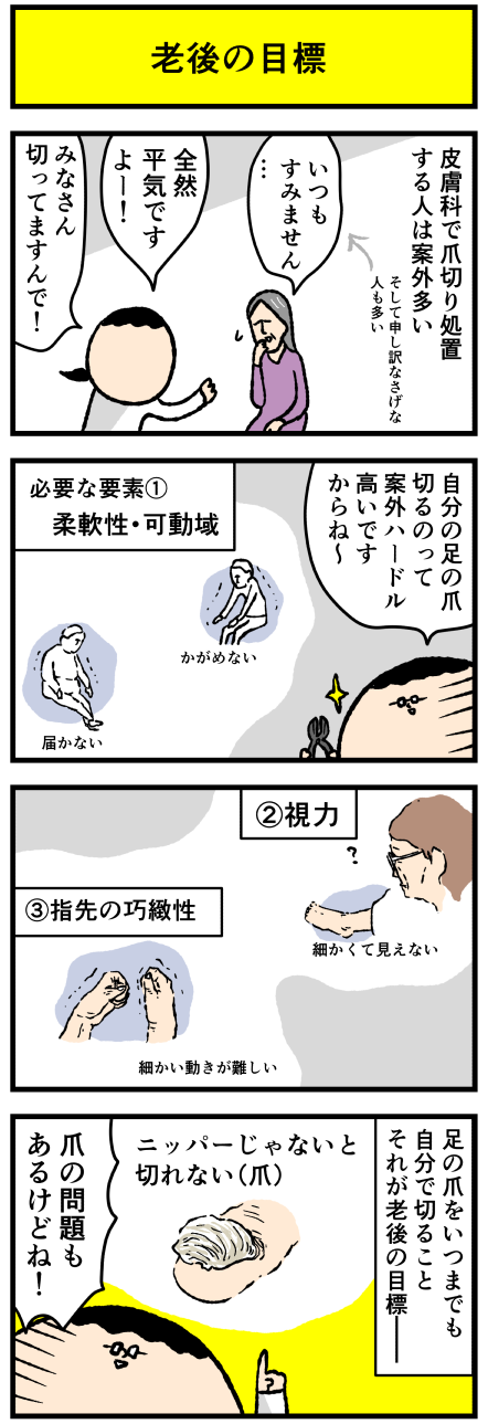 2021年11月17日 足の爪を切るというハードル アロ~ハ☆今日も元気なデルぽんで~す☆本日は足爪な話~☆彡足の爪を切るというハードルについて漫画にしたよー!!どうぞー!!爪切り処置すきだし外来きてくれるの全然かまわない☆彡 厚い爪はもちろん、普通の薄い爪でも自分では切れなくて通っている人もいる。足の爪を カテゴリ: デルマンガ