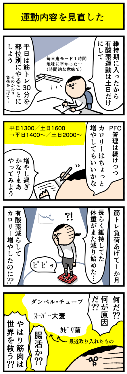 2022年01月07日 有酸素運動を減らしてみた結果 アロ~ハ☆今日も元気なデルぽんで~す☆本日は減量なお話ー!!維持期も久しいのでそろそろ有酸素運動減らそうと思ってね、運動内容とカロリーを見直してみたんだけどねー!!自分でも驚きの結果が待っていたよ!!どうぞー!!!摂取カロリーを増やして有酸素運動を減らし カテゴリ: 日常マンガ
