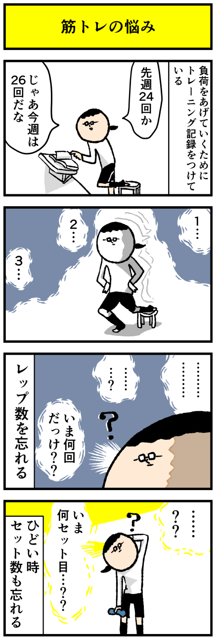 2022年02月19日 筋トレの地味な悩み アロ~ハ☆今日も元気なデルぽんで~す☆本日は筋トレなお話ー!!地味に悩んでいる!!どうぞー!!!10越えたあたりから怪しくなってきて20なのか30なのかそもそも何回目なのかわからなくなる・・・これなんて認知・・・筋トレのまえに脳トレをすべきか?!?!もう カテゴリ: 日常マンガ