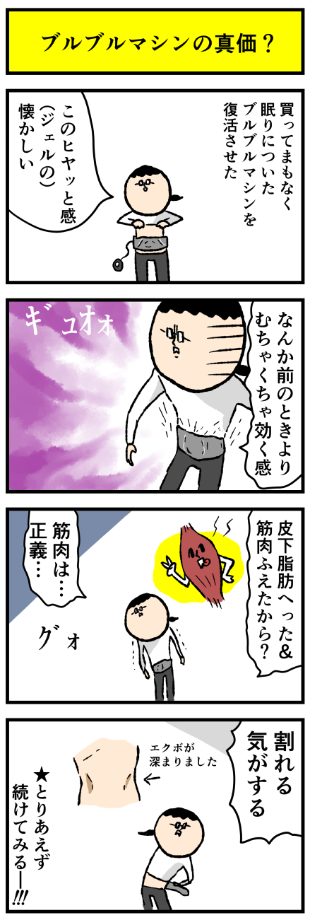 2022年03月19日 腹筋ブルブルマシンを復活させたところ・・・ アロ~ハ☆今日も元気なデルぽんで~す☆デルぽん最近ふっきんブルブルマシンを復活させたんだけどねー!!以前と違う感触があったので漫画にしたよー!!どうぞー!!前買って使ったとき正直よくわからん。。。てなってしまいこんでそのまま眠りについていたブルブルマシンだが カテゴリ: 日常マンガ