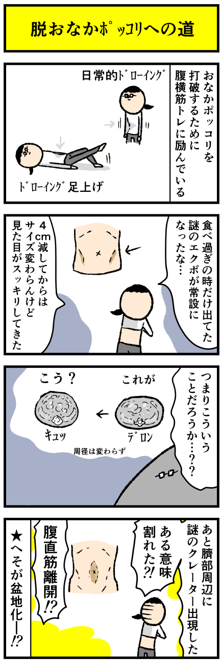 2021年12月06日 腹筋事変 アロ~ハ☆今日も元気なデルぽんで~す☆デルぽん毎朝ライザップごっこして遊んでるんだけどねー!!最近、腹部に異変が生じているのに気がついたので漫画にしたよ!!どうぞー!!伝わるかわかんないけどヘソのまわりだけ腹直筋が途切れて、奥から硬いモッコリしたものがは カテゴリ: 日常マンガ