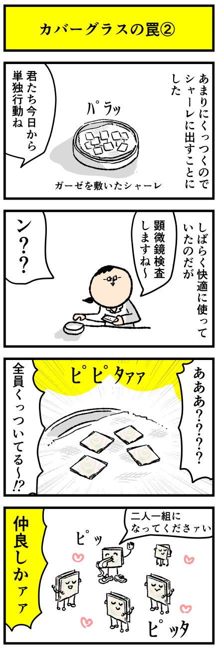 2021年03月03日 カバーグラスにありがちな罠② アロ~ハ☆今日も元気なデルぽんで~す☆顕微鏡検査に使うカバーグラスが、取りだすとき2枚重なりがち!その対策をしてみた結果・・・?!前回からの続き!どうぞー!!チクショウ・・・全員仲良しか・・・・・・OTLシャーレに平置き作戦、ちょっといいかと思いきや、謎の力 カテゴリ: デルマンガ