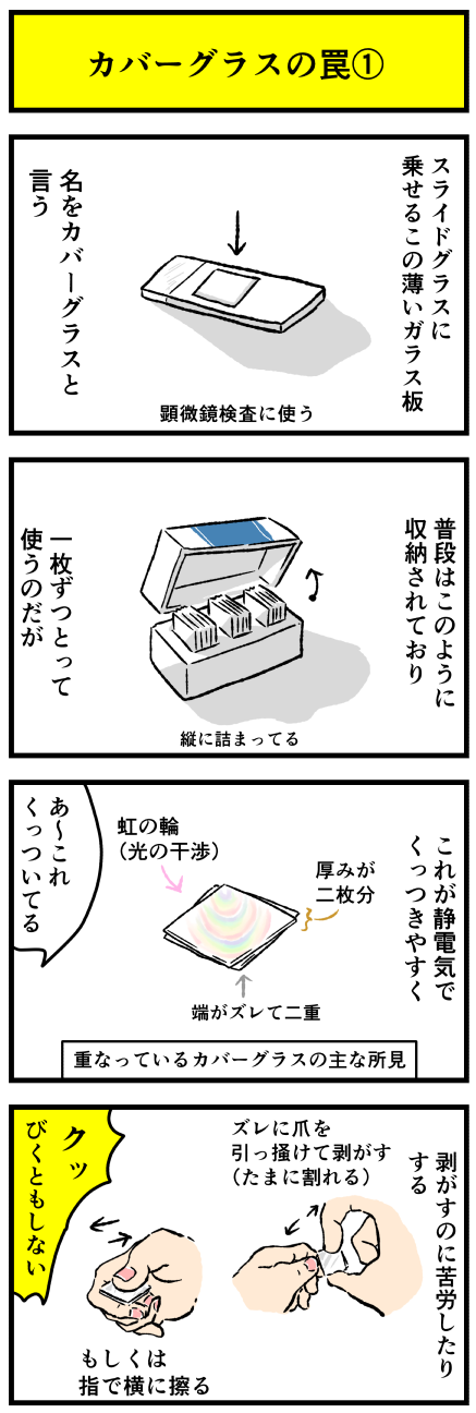 2021年03月01日 カバーグラスにありがちな罠① アロ~ハ☆今日も元気なデルぽんで~す☆本日は顕微鏡なお話!!皮膚科では検鏡のさいによく使うカバーグラスのお話だよ!!どうぞー!!カバーグラスがくっついちゃうのって静電気なのかな?というか普通に湿度?よくわからぬが、こやつら、とかく隣同士とくっつきあいがち カテゴリ: デルマンガ
