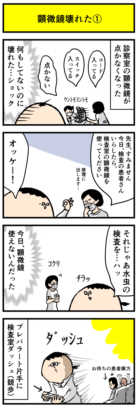 2020年12月11日 顕微鏡がぶっ壊れた① アロ~ハ☆今日も元気なデルぽんで~す☆外来の顕微鏡がぶっ壊れたので漫画にしたよ!前後編!!どうぞー!!待ち合いの前通らないと行けなくて毎回すごい気まずい・・・はよ直って(人∀・)タノム次回!!検査室での様子に続く!!でわね!バーイ☆ 顕微鏡ないの地味に痛い・ カテゴリ: デルマンガ