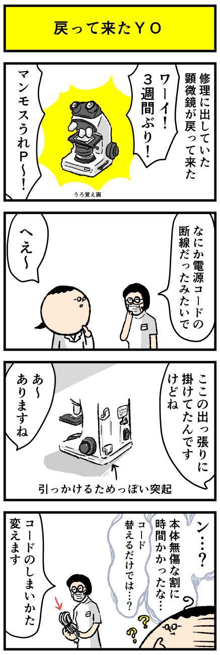 2020年12月18日 顕微鏡が戻ってきた☆ アロ~ハ☆今日も元気なデルぽんで~す☆ずっと故障で修理に出てた顕微鏡もどってきた~~~!!!喜びの漫画☆彡どうぞ~!!師長さん曰く顕微鏡の電源コードの断線だったようで??本体じゃなくてコードだったわりには戻ってくるまでに時間がかかった・・・何はともあれ本 カテゴリ: デルマンガ