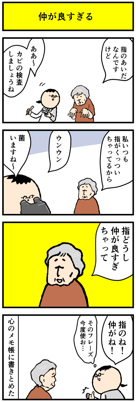 2021年06月15日 仲が良すぎて アロ~ハ☆今日も元気なデルぽんで~す☆本日は外来なお話し~☆患者さんとのやりとりを漫画にしたよ!どうぞ~!!こんど機会あったら外来で使お!とおもった🐈指の間の赤みが出たり消えたりなかなか治らない!というひとはカンジダ(菌)のことがあるよ~~~~~~おいで カテゴリ: デルマンガ