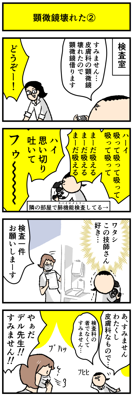 2020年12月13日 顕微鏡がぶっ壊れた② アロ~ハ☆今日も元気なデルぽんで~す☆外来の顕微鏡が壊れて検査室のを使うことになったけど・・・??前回に続く後編です!どうぞー!!また院内にひとり好きな人みつけてしまった・・( ̄ー ̄)ニヤリ元気がよろしい!!!早く顕微鏡戻ってこーいコーイコーイ・・でわね!バーイ カテゴリ: デルマンガ