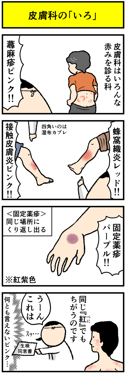 2017年10月22日 【KOKUTAI vol.6】皮膚科の「いろ」 アロ~ハ☆今日も元気なデルぽんで~す☆本日は、医学生向けフリーペーパーKOKUTAIから掲載漫画のご紹介☆皮膚科の色について漫画にしました~!どうぞ~~~☆皮疹にも色々なタイプがありますが(蕁麻疹⇒膨疹、蜂窩織炎⇒紅斑(潮紅)、接触皮膚炎⇒丘疹(集蔟し湿疹))ぜ カテゴリ: デルマンガ