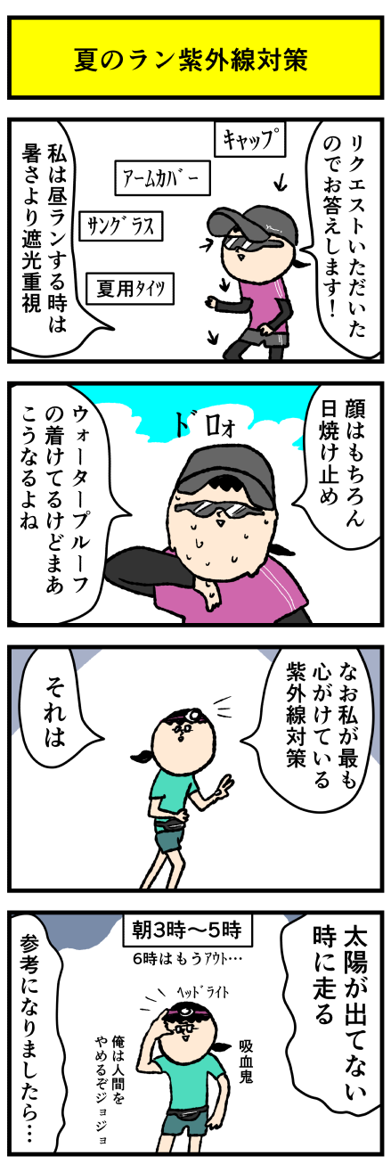 2022年08月29日 夏のランニング紫外線対策 アロ~ハ☆今日も元気なデルぽんで~す☆本日はランニングな話ー!夏の紫外線対策どうしてますか?という質問があったので漫画にしたよー!どうぞー!!ランニングイベントとか大会以外は基本的に昼には走らないようにしてるゥ(暑いし紫外線気になるカラ)この時期、6時になる カテゴリ: 日常マンガ